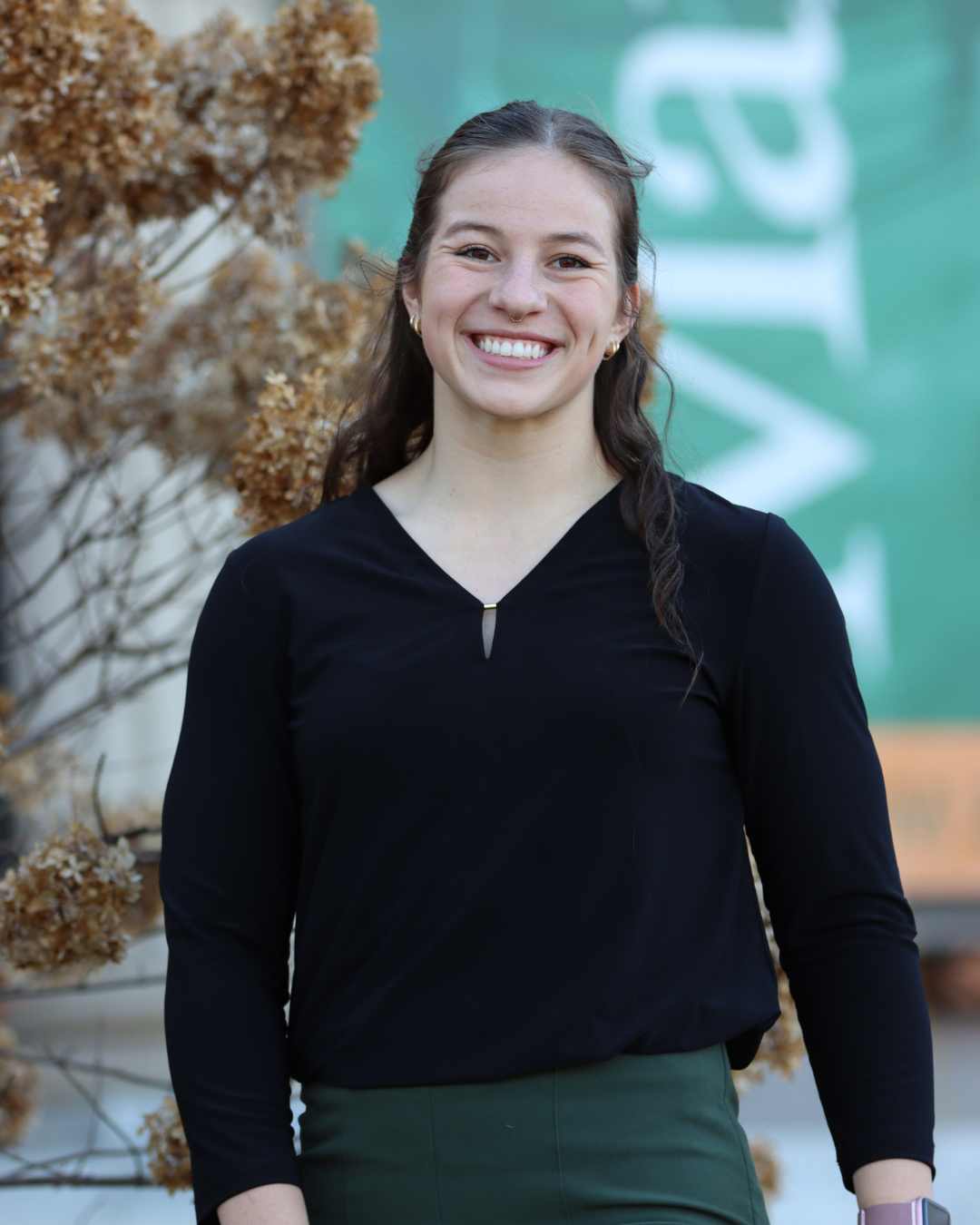 Rosalyn smiles outside of Marywood University's Liberal Arts Center